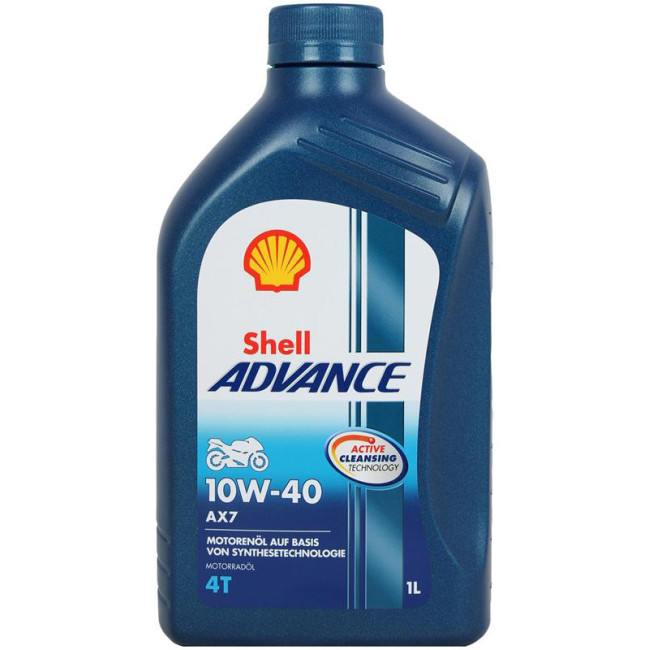Shell Advance 4T AX7 - моторна олива преміум-класу від Shell для 4-тактних двигунів мотоциклів. Її напівсинтетична формула містить високоякісні синтетичні базові оливи та спеціальний пакет присадок для мотоциклів з унікальною технологією Shell Active Cleansing Technology. Це допомагає очистити двигун і підтримувати його в чистоті. Чистий двигун мотоцикла краще захищений і забезпечує кращу ефективність і продуктивність. Олива Shell Advance 4T AX7 10W-40 для 4-тактних двигунів відповідає вимогам більшості виробників мотоциклів.